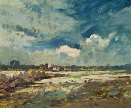 During the 8 years since he left art school Tim has evolved as a painter, refining both his technique and the interpretation of his subject. In recent years his attention has fallen on the flatlands of East Anglia, in particular Norfolk and Suffolk. It is no coincidence that this is where both Constable and Seago made some of their most powerful works, as the combination of impossibly vast skies and abrupt verticals in a sometimes overwhelmingly horizontal landscape creates views that have a stark beauty found nowhere else. Tim, like those great artists before him, is not interested in the minutiae of a landscape, preferring instead to render the subject with loose, expressive brush strokes and a muted palette that reflects the earthy hues of the scenes he paints.