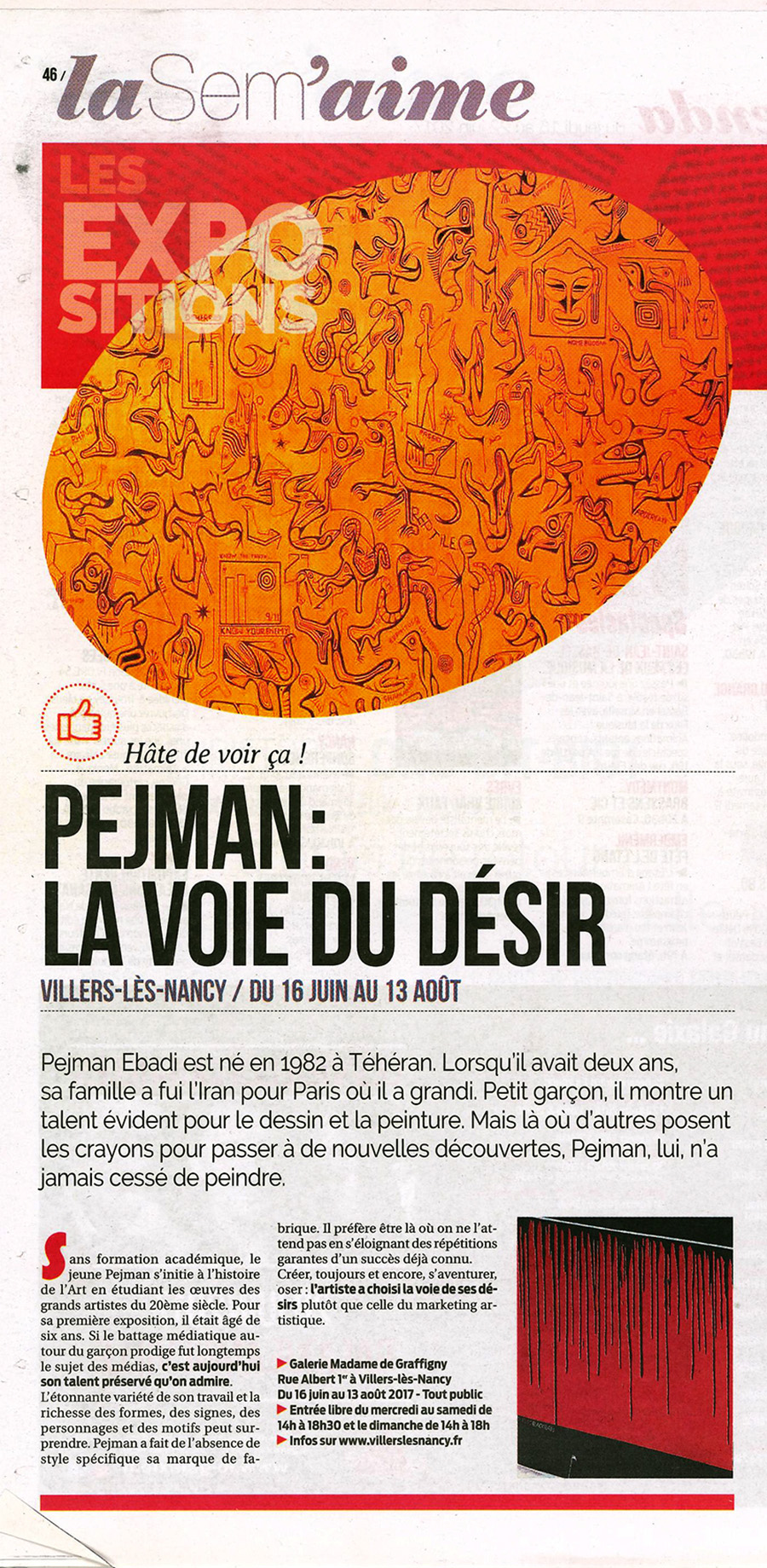 Pejman participates for the first time in a collective exhibition in Paris in 1988 and holds his first solo show in Les Lilas, outside Paris, three years later in 1991. The next year he holds solo shows in Metz, Berlin and Solothurn. Pejman has realised over fifty solo and over twenty group shows so far. Three monographs retrace his entire production until 2007. Pejman has held important venues in Paris, Berlin, Hamburg, Metz, Lyon, Montreal, Toronto, Bern, Zurich and Copenhagen. In the year 2000, Metz’s Arsenal offers him his first retrospective where 150 works covering fifteen years of work are shown in a public institution.