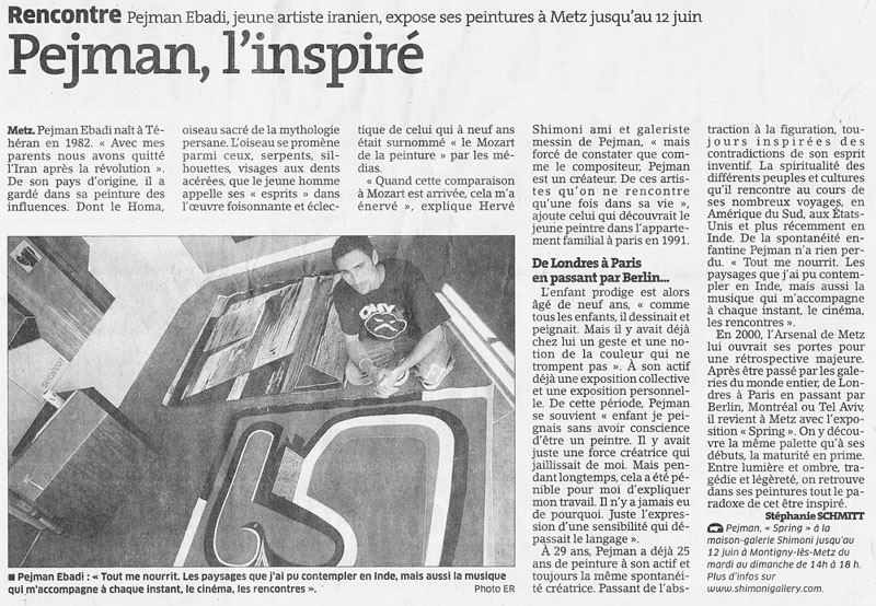 Pejman Ebadi was born in 1982 in Teheran. His family fled from the Ayatollahs to Paris where he grew up. The little boy showed an obvious drawing talent at an age when he was still at nursery school. Since then he has painted incessantly.