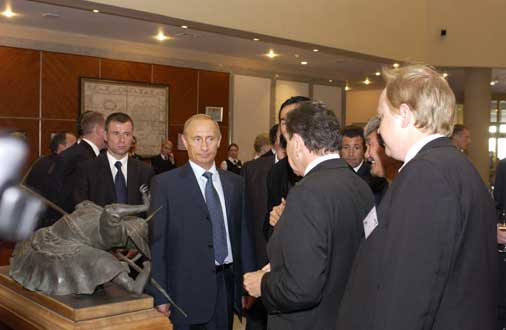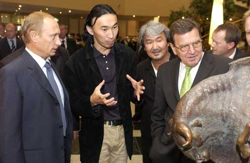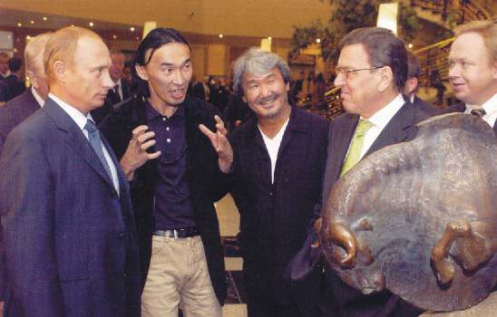 Dashi Namdakov makes for an unlikely favourite of the Russian elite. The 37-year-old ethnic Mongolian sculptor grew up in an idyllic Siberian hamlet on the Russian-Chinese border. He belongs to the Buryat clan, which is descended from the medieval marauder Genghis Khan. The clan is Buddhist, though some members are shamanists whose ancient faith includes animal worship and divination. Namdakov draws on this eclectic background—and an episode during his childhood, when he was cured of a serious illness by a shaman—to reproduce his own visions in metal, primarily bronze. "Mysterious images haunt me at night," he confides. He has sold two of his works to billionaire oligarch Roman Abramovich. President Vladimir Putin owns a couple of Namdakov originals and considers him one of his favourite artists; he even escorted visiting German Chancellor Gerhard Schroeder to the sculptor's Moscow studio on a recent state visit.