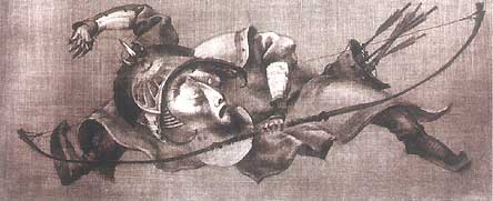 "Bowman" is a soldier in samurai armour who stretches in a gravity-defying posture only Jet Li could duplicate. His Asian features — flat face, high cheekbones, almond eyes, Fu Manchu beard — and grace are typical of Dashi's sculptures.
