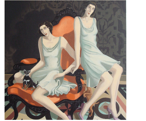 Isabelle lives and paints in Paris, in a former diamond-cutter’s workshop built from remnants of the Eiffel Tower, surrounded by stuffed spiders and rickety Napoleonic furniture. Antiques, curiosity shops, social life and late 19th century literature provide the inspiration for her work. Like the characters in a Scott Fitzgerald novel the languid inhabitants of her paintings subtly convey the shadow side of an idle existence.