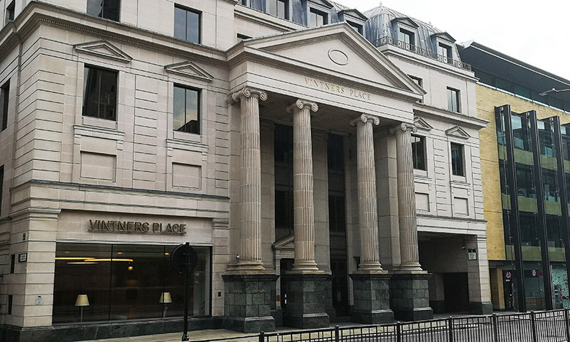 Vintners' Place is a 1980s classical-style office building in the City of London. It faces the Thames and has entrances in Upper Thames Street and Queen Street Place, with the building surrounding Five Kings House and Vintners' Hall. The neighbouring building on the west side is Thames Court, 1 Queenhithe, while on the east side Queen Street Place leads to Southwark Bridge.