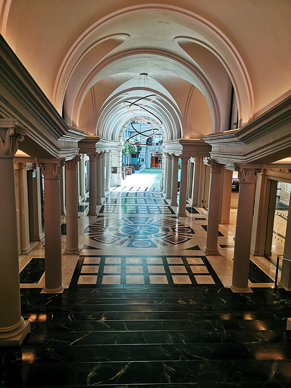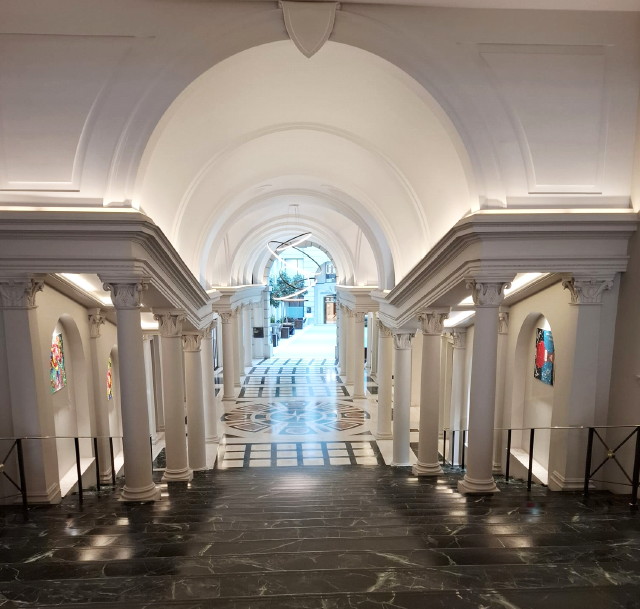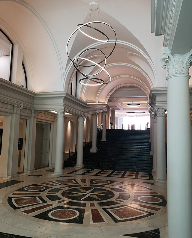 The floors in all the main public areas are in elaborately-patterned marble, echoing motifs from St Peter's and other Roman churches by Bernini. Bands of Estremoz marble frame the patterned areas and help define the architectural and structural grid. The radical design of the Compass Hall revolves around a central sun/compass which highlights the new orientation of the building at this point and directs visitors to the main stairway and the South Gallery. Magnificent stairway inspired by a Bernini original in the Vatican, it leads to the entrance Atrium on the main floor of the Gallery. The marble steps with their carefully-measured height rise between freestanding columns and walls decorated with niches on either side. The Stairway broadens out invitingly as it descends and leads to a hall dominated by succeeding arches accessing the lifts to the north, and then, to the right, runs through the Gallery with its sky-lighted six floors.