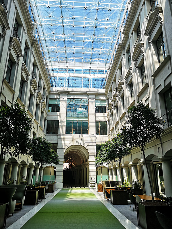 Vintners Place is a new, 37,000 m˛ office building overlooking the Thames in the City of London. Built in a classic style, it is next to the historical, listed Vintners Hall owned by the Vintners Company. The client had requested that the marble floor be realised from interesting and different types of material and should be inspired by St Peter’s in Rome. Whinney Mackay-Lewis, who were also the building’s architects, won the international competition for an 800 m˛ floor in a pattern that displayed a range of colours and explored the chromatic wealth and veins of different marbles from countries around the Mediterranean.