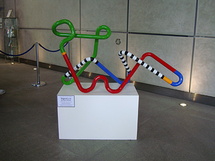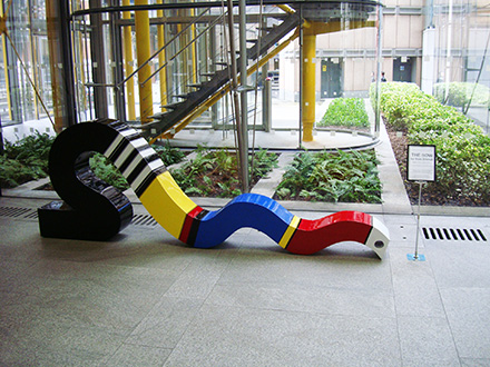88 Wood Street is a commercial skyscraper in London, located on Wood Street in the City of London. The architect was the Richard Rogers Partnership (RRP), now known as Rogers Stirk Harbour + Partners. The building was constructed between 1993 and 2001. The 18-storey structure has an office space of 33,000 m2 In 1990, following a limited design competition, RRP was commissioned by Daiwa Europe Properties to design their new London headquarters on a site at the corner of Wood Street and London Wall. The twin economic recessions that hit Europe and the Far East, however, obliged Daiwa to rethink its strategy and the prestigious headquarters project was abandoned. The site stood vacant for three years, after which a new brief was given to RRP to design a speculative, high-quality, commercially lettable building, larger and more economical than its predecessor. The site lies at the heart of the City of London, between St Paul's Cathedral and Moorgate. It previously housed two telephone exchange buildings, one of which had been spot-listed prior to the commencement of the works. The building was subsequently de-listed and demolished along with a 1960s office building. Within the existing basement, however, was a fully functioning British Telecom exchange chamber, which was required to remain in operation during demolition, construction and occupation of the new building. Eighty-eight Wood Street is adjacent to the tower of the Grade I listed St Alban's Church, designed by Sir Christopher Wren (the remainder of the church was destroyed during World War II). In addition, the site is bounded by two historic churchyards; St Mary's to the south and St Olaves to the west (the latter destroyed in the Great Fire of London) . Surrounding the site are various contemporary buildings ranging in height from four to 23 storeys. Planning permission was granted for the initial headquarters scheme in 1992. The development was the subject of protracted and complex planning negotiations with the Corporation of London planning department especially in relation to viewing corridors from the South Bank, St Paul's Cathedral and the Barbican terrace. In order to avoid resubmitting a new application, the development envelope established by the initial application was adhered to for the second design, despite the requirement for more floor space. The 33,000 square meter building is arranged as three linked blocks of office accommodation that step up from eight storeys on Wood Street, where the context includes two listed buildings, to fourteen and finally eighteen storeys to the west, responding to the taller built topography towards London Wall. By using the extensive basement of the demolished telephone exchange for plant, roof levels were kept largely free. The office wings are constructed of in situ concrete which contrasts with the lightweight, steel-framed service towers containing toilets, lifts and dramatic, fully glazed stairs. The use of brilliant colour enhances their impact - air intakes and extracts at street level are also brightly coloured, contrasting with the neutrality of the occupied floors. The generosity of the scheme is reflected in the spacious, 8 metre-high entrance lobby, floored in granite as an extension of the external landscaping. This reception area features a 54 metre-long wall running the length of the building. The facades of the main office floors are glazed from floor to ceiling to maximise daylight and views - in addition, levels 8, 12 and 16 lead directly onto roof terraces with spectacular views over the city skyline. Hay Hill Gallery is collaborating with ARTful Ltd, exhibiting contemporary sculpture at the entrance hall of 88 Wood Street business centre. Featured Artist: Sam Shendi’s works references the work of “minimalism”, the style of paring-down design elements and focusing on the medium of steel, aluminum and paint. Some of his works are deceptively simple in form but include the qualities of metaphorical associations, symbolism and suggestions of spiritual transcendence.