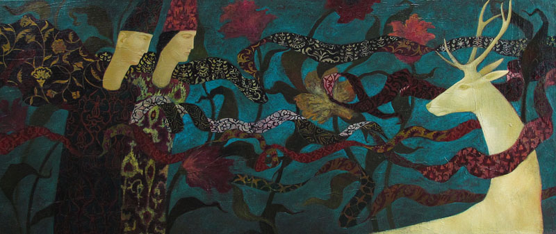 Drawing profoundly philosophical thought from his personal studies into mystical, biblical and Celtic mythology, D’Vatz’s emblematic works are meticulously detailed. He fuses vibrant byzantine colours with ancient culture and the traditions of Central Asia to create powerfully iconic images. Luminous winged stags with bronze flags guard black panelled doors; ghostly cities are embroidered upon clouds. Mist settles eerily about oddly tall hunters as dust billows up from galloping hooves. These elegant mythical creatures lure the viewer into a hauntingly mnemonic experience.