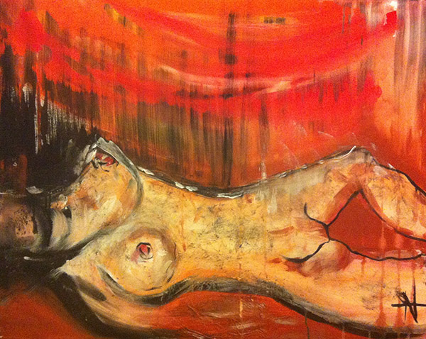 Natália Gromicho’s highly pigmented glazes gloss the boundaries between figure and abstraction, creating shifts in focus and scale. The dialled tones range across her canvases from cool-eyed blues to fiery madder hues. The use of wet and dry brushwork adds to the subtle variations in mood- shiny as slick taillights in the rain, as grubby as the exhaust fumes that blacken the puddles. With a style as energetic as the Lisbon streets’ desiccating slogans and sunset red riots, it is easy to see the personal influence of this bright chaotic city on the artist.