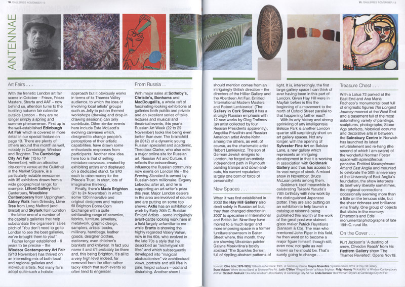 When it was first established in 2002 the Hay Hill Gallery also dealt solely in Russian art but, they then changed direction in 2007 to specialise in International and British Art. Now they have moved to a much larger and more imposing space in a former furniture showroom in Baker Street where, this month, they are showing Ukrainian painter Galyna Moskvitina's boldly abstract The Sparkles Series', full of rippling abstract patterns of light. It is, interestingly, the first large gallery space I can think of ever having been in this part of London. Given Hay Hill were in Mayfair before is this the beginning of a movement to the north of Oxford Street parallel to that happening further east? ...