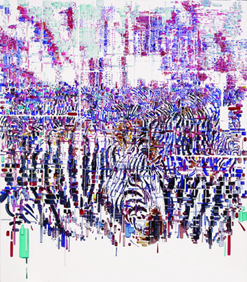 Giuseppe Linardi’s Decoded exhibition for Hay Hill Gallery is a not-to-be-missed visual experience. The bright canvases are a matrix of optical sensations as disconcerting as magic-eye pictures or interactive screens; reminiscent of bit-map zeros and ones, the broad dots and dashes merge to unveil their hidden subjects. The works could be seen as a kaleidoscopic rendering of the data we leave in our wake - an endless obsession with documenting our existence.