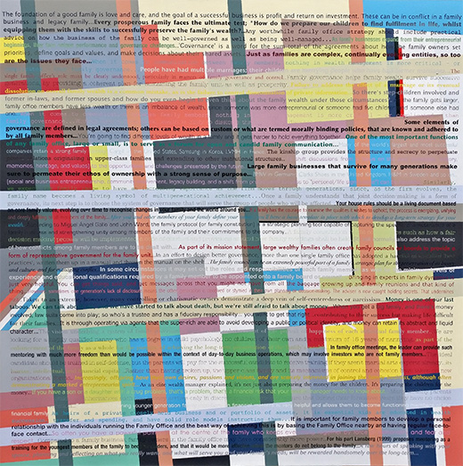 I’ve been working on this series over the last two years. In the process, I’ve discovered some really revealing studies about family business wealth. The series fuses topical tips on how to run your SFO effectively, as well as academic discourse on family conflict resolution and contested inheritance. It’s the interplay between these dynamics that I find fascinating. As with my previous AAAD series, I research and gather numerous references to my subject from experts and commentators across the globe. I then assemble the most varied and telling verbatim texts to narrate the story in bright, colourful, themed paintings. "This relatively unknown form of organization – the "family office" – may prove to be one of the more important means available to wealthy families for maintaining their social and economic position in society.”