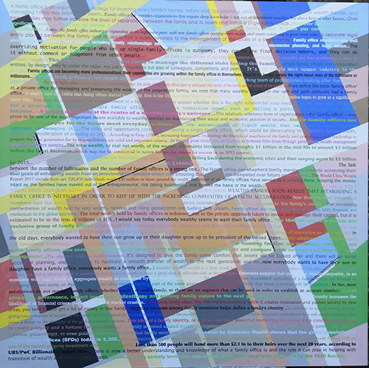 Single Family Offices are complex. In fact, each office has its own polity and agenda, but there are structural commonalities. The question of whether to outsource certain functions, due to cost factors or the need for certain expertise, should be viewed and reviewed in relation to the changing fortunes and circumstances of the family. People, both in finance and in art, have often asked me how the pieces are made. So, here is a little technical information about the process I adopt for my AAAD paintings… Each painting is on a gesso-primed board measuring 105cm x 105cm. For this new series, all the paintings have a background design that suggests an architectural drawing of an office, over which the text is laid. “I am often struck by how overwhelmed families are by the complexity and sense of burden that comes with managing wealth across generations.” These texts, their typefaces and layouts are designed on a computer in my studio, and then taken to a specialist stencil-maker. When the stencil is placed on the prepared board, the letters are exposed for the text to be spray-painted, all the other parts being masked off. In this way, I progress down the board, selecting and blending the colours for the texts according to the content of the wording, the underlying background and overall aesthetic I am looking for. Each individual quotation has its own typeface and colour. To borrow a term from finance, every word is positioned, coloured and shaped so as to gain maximum leverage for my chosen subject. “The judiciary in the low-tax jurisdictions that one typically works in are, generally speaking, very alive to the need to make these structures work, so there are considerable opportunities there.” During the research phase of Single Family Office, I contacted a number of specialists in behavioural economics and taxation planning, and psychotherapists who work with the ultra-wealthy. I am grateful to a number of them for bringing certain published, as well as their own about-to-be-published, articles to my attention. “Large single family offices with liquid assets may wish to appoint different investment managers to manage each pool of assets and to segregate them from one another in a structure which they control.” “Lenders are exploring the possibility of securitizing art loans as a way to lower the financial risk of carrying art on their balance sheet. Securitization could take the form of Art Collateralized Debt Obligations (ACDO) or an Art Credit-Default-Swap (ACDS)...” Art as a Derivative V – Single Family Office will be a comprehensive analysis of this worldwide and rapidly expanding aspect of private wealth management: a unique study, with a unique place in the contemporary art landscape.
