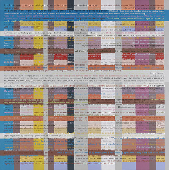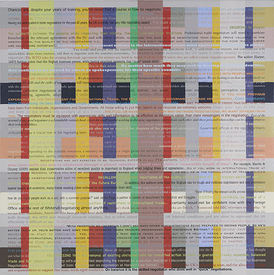 At a time in the global economic cycle when many countries are keen to protect their own economies, it is all too easy to lose sight of how important it is to remain internationally focused with regard to trade. In the giddy, non-stop, multi-channel news cycle, Art as a Derivative makes art through a paradox – by holding up the essence of the most challenging issues of our time and turning them into a form of 21st-century hieroglyphics. ...Weaker parties therefore face a dual challenge: they must both advance their interests in the rule-making negotiations and also increase the security of agreements. Art as a Derivative has a proven track record in anticipating economic and political trends. And perhaps international trade policy is the sphere, right now, that impacts the global population more than any other; here the artist can play a vital role. Don't do something in the short run that will come back to hurt you in the long run, that's not smart negotiation... The Art of Trade Negotiation required a research process in which tens of thousands of lines of verbatim text were read and sifted. Texts originating from diplomatic sources, global trade negotiators, academic conferences, leading legal and constitutional opinion as well as financial journalists and deal-making gurus were compiled. In a strict sense every free-trade agreement under which tariffs are eliminated over several years is an interim agreement... In one very real sense, the words themselves, their tone and stance, became my palette. I identified eight key themes that will be essential in reshaping the UK's relationship with the EU and will, in a wider sense, say much about the national self-image negotiators are aiming to present to the world. Understanding the purpose of trade agreements has immediate implications for how trade negotiations are conducted... Art as a Derivative IV – The Art of Trade Negotiation is unique: it combines a highly analytical approach to the negotiating process, whilst remembering that the critical importance of these talks will not protect them from becoming mired in the detail and legal code that is particular to formal free trade agreements. ...Always cooperate, until provoked; if provoked, always retaliate with equal force; be quick to forgive. In short, the whole thing could become so turgid that anyone not involved with or directly implicated in the talks could lose interest; and this in turn could have a serious impact on outcomes. How confidential is the information you are sharing? As a general rule, openness within government circles is important, but obviously details of negotiating strategies should not be available for all to see... Each of the eight 1-metre-square paintings explores a different aspect of the negotiating process in some 1,500 words of verbatim text. These texts are crafted into "dialogues" where opinion, past experience, rules and regulations and headlines meet and connect over a grid of intersecting brightly coloured columns.