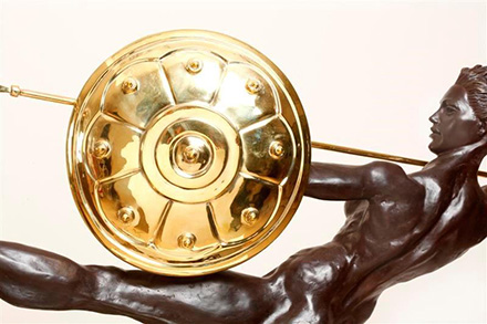SCULPTURE Richard has created a supreme female athlete with a body reflecting physical excellence, capable of throwing her long heavy golden spear further and with more power than any man. Yet she is beautiful, graceful, feminine and extremely erotic. Her outstretched left leg is the leg of the most beautiful ballet dancer. Notice the delicacy of the way her breasts are curved, with such gentleness in the curves flowing out to the nipples, the firm flesh below the breasts swelling slightly around her muscular belly and then curving back into the pubic area. Her long legs, starting with firm perfect thighs, reflect the perfection of her legs. Note her beautiful back and luscious firm buttocks. The patination of the bronze is in Classic Rodin Style: first, a rich brown undercoating and then a black overcoating, so when the light dances on the sculpture the brown undercoating shows through. The gold shield, spear and helmet (which is cast in brass and then highly polished) gives a wonderful contrast to the rich patination of the bronze figure. Richard Minns