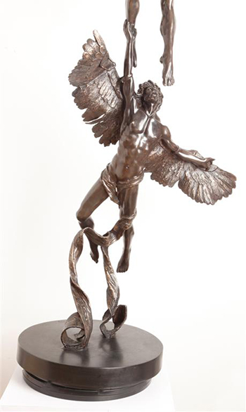 SCULPTURE’S DESCRIPTION Icarus is at the top, exhilarated with his ability to fly, and he is flying straight for the sun … and his doom. His father, Daedalus, is flying safely below, right arm outstretched high, holding his son’s ankle, attempting (in vain) to restrain him. Actually, Flying Too High (Daedalus and Icarus), where Icarus is flying straight for the sun and his father Daedalus is frantically trying to restrain him, is a companion sculpture to Icarus’ Final Moment, where Icarus (in mid-air), is about to crash into the sea, his body contorted in perfect Greek Pathos, his melted wings hanging limply under him. This sculpture is first a masterpiece in engineering and architecture. In order to show Dadealus and Icarus soaring high in the air and to create the illusion of defying gravity, Daedalus is flying in one direction and Icarus is flying in the opposite direction, creating a horizontal “V” shape so that the center of gravity is perpendicular to the center of the two bodies allowing the sculpture to stand solid and firm, but clearly giving the illusion of defying gravity … and FLIGHT! The relationship of the bodies of Daedalus and Icarus has maximum grace and fluidity of form, expressing power, emotion, conflict and maximum movement. It is a beautiful ballet of forms in the air. The expression on Daedalus’ face, anguish and concern over the fate of his disobedient son, is in contrast to the expression on Icarus’ face, exhilaration and rapture in his freedom of being able to fly. This is the original prodigal son story. The surface modeling is vintage Richard Minns at his best. No detail is overlooked … from Daedalus’ windblown hair … to Icarus’ wild hair covering his left eye … to every feather on their wings … to the stirrups which hold the wings to their arms. Nothing misses Richard’s watchful eyes. This sculpture LIVES! ARTIST’S