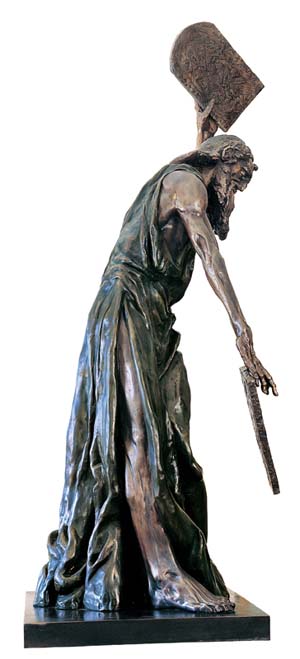 The MOSES most often depicted by artists and sculptors is the radiant MOSES on Mount Sinai, holding the two Commandment Tablets over his head in triumph. However, as you know, MOSES triumph was short-lived and quickly turned to despair when he discovered in horror that he and God had been betrayed by the Israelites. Richard's MOSES is the picture of pathos, emotion, action and movement: A great man, crushed and angered, caught in the moment of his betrayal.