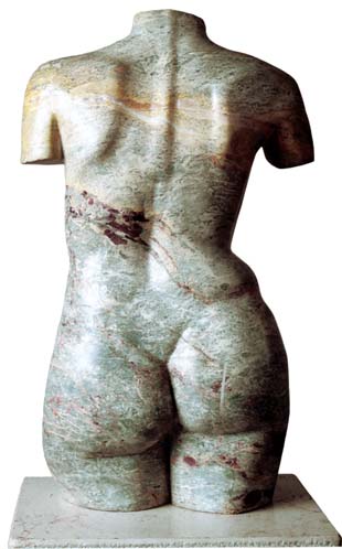 Richard's sculpture of Delilah, another Venus d'Milo-style torso, could be mistaken for the work of a Renaissance Old Master. Carved out of beautiful marble, the sculpture displays the magnificent polished texture of this remarkable piece of stone, while the Classical Renaissance beauty of Delilah springs forth. Every line in her body is a delight to see: her petite, but full, breasts, and her rounded stomach. However, as you walk around this sculpture it is Delilah's rear view that is especially stunning. This is truly a temptress who conquered the strongest man in the world.