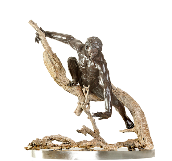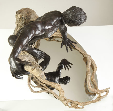 DESCRIPTION OF SCULPTURE 1. Psychology. Origin of the term “Narcissism”, a fixation with oneself. 2. Art. The myth of Narcissus has inspired artists for at least two thousand years, even before the Roman poet Ovid featured a version in Book III of his “Metamorphoses”. 3. Literature – Too numerous to list. Includes Oscar Wilde’s “The Picture of Dorian Gray”, Herman Melville’s “Moby Dick” and William Faulkner’s character “Narcissa” in “Sanctuary”. Richard’s Narcissus is an anatomically perfect youth, athletic, physically beautiful. But, as Richard says: “more of an Apollo than a Hercules”, inspired by Michelangelo’s “David” and Rodin’s “Adam”. Narcissus’ outstretched long fingers are a bit of an inspiration of Egon Schiele. Narcissus is modeled in Rodin-style, and the patination is strictly Rodin, with a brown undercoating first baked into the metal and then covered by a rich black so when the light dances on Narcissus, the brown undercoating shines through subtly, but brilliantly. The tree and supporting vines which circle the lake is a combination of Richard’s unique skills and Mother Nature. Richard went on a hunting expedition in the forest to find the tree limbs and the vines with the exact texture he wanted. Then he made a mold of the tree limbs and the vines and turned them into a wax which he could bend and mold to meet the desired position and effect. A special patina made the bronze tree and vines come alive. The polished stainless steel base acts as a reflection pool, reflecting Narcissus’ face, body and outstretched hand. The only way the viewer can get a full view of Narcissus’ face is to look at his reflection of the pool below.Richard Minns