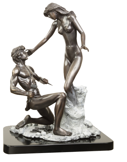 RICHARD L. MINNS Medium-size table top bronze. Classic potash rich dark brown patination on Pygmalion and Galatea. Black patination on Pygmalion’s sculptor’s tools. Special grey/white marble patination on ground and marble part of Galatea’s statue. 79 cm high x 54 cm long x 37cm wide, 31 in high x 21 in long x 15 in wide. CLASSICAL MYTHOLOGY As written in Ovid’s Metamorphosis, Pygmalion was a very handsome and very famous young sculptor in ancient Cyprus who wanted to marry and raise a family, but he could not find a woman who measured up to his standard of perfection. Therefore, he summoned all of his great skills and created the perfect woman out of a block of marble, then falling hopelessly in love with his creation. Pygmalion prayed to Aphrodite (Venus), the goddess of love, who gave the marble statue the gift of life. Pygmalion took his creation in his arms and since her fair skin was as white as milk, he named her Galatea, after the Greek word for milk. They had a son, Paphos, and the Cyprus city of Paphos bears his name to this day, preserving the story for all eternity. DESCRIPTION OF SCULPTURE The basic Pygmalion story has made its influence in literary / art / musical history more than any other Greek myth as each generation of artists, sculptors, writers, poets, playwrights, composers and musicians continue the Pygmalion concept in art, sculpture, literature, theatre, opera and cinema. First to come to mind is George Bernard Shaw’s award-winning play “Pygmalion”, which was turned into the award-winning stage and screen musical “My Fair Lady”, starring Rex Harrison as “Professor Higgins” and Audrey Hepburn as “Eliza Doolittle”. The seemingly endless list of branches from the Pygmalion tree includes “Phantom of the Opera”, “Educating Rita”, Nathaniel Hawthorne’s “The Birth-Mark”, Oscar Wilde’s “The Picture of Dorian Gray”, “Pinocchio”, even Mary Shelley’s “Frankenstein” and even the Simpsons’ episode entitled “Pygmoelian”. Artists and sculptors who have given their interpretation of Pygmalion include Auguste Rodin, Francisco Goya, Honoré Daumier, Edward Burne-Jones, Paul Delvaux, among countless others. Richard now enters the classical ring with his interpretation. Richard’s Pygmalion, his sculptor’s chisel in one hand and hammer in the other, is kneeling before his marble creation of Galatea, making the final touches. He hears a movement and laughter above him and looks up to see to his surprise and delight that Venus (Aphrodite) has granted his prayers and his creation has come to life. Galatea, laughing, reaches out to her lover, touching his cheek. To effectively portray this metamorphosis, Galatea’s upper half (the part which has come alive) is in bronze (like Pygmalion), where the lower part of her legs is still in marble. To create contrast and drama, the ground is white marble, which stands out on the ivory black polished base. Pygmalion’s sculpture tools are scattered on the white marble ground. The tools are covered with a black patina, in stark contrast to the white ground. Pygmalion and the part of Galatea which has come alive has a classic potash rich dark brown patination to effectively portray Galatea’s metamorphosis. Now the beauty of this magnificent bronze and marble sculpture is that the sculpture is 100% bronze and there is no marble on it. The white marble block, which Galatea is breaking out of, and the white marble floor is not real marble. Richard can create a bronze sculpture which looks identical to marble. This is the beauty of having a patination master and Richard’s foundry has one of the best in the world. ARTIST’S INTERPRETATION “I am an ex-Journalism professor and a frustrated “Story Teller”. I get great pleasure writing stories and reading them, first to my children (now grown), then to my grandchildren (now grown), and presently to my great grandchildren.” “The purpose of my sculptures is to tell a story. If my sculpture needs to be explained to the viewer, then I have failed. My sculpture stories are about the heroes of the Bible and the heroes of classical mythology. (Of course, it helps if the viewer knows the story.)” “My interpretation of Pygmalion is a young, handsome sculptor with a pleasing trim athletic body, but certainly not a Hercules, Samson or an Achilles. Galatea is the perfect woman – or at least Pygmalion’s concept of the perfect woman for him. Slim, feminine, with large eyes and Angelina Jolie lips.” “By casting the entire sculpture in bronze and relying on my patination expert to simulate marble, I was able to show a mixture of classic potash and white patina slowly blending together on Galatea’s legs. Look close. I think you will like it.” “I could say more, but I will let me sculpture speak for me. If you feel I have effectively told the Pygmalion story, then I have succeeded.”Richard L. Minns