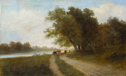 MIKHAIL KLODT (1832-1902) Mikhail Konstantinovich Klodt baron von Jürgensburg (1832–1902; both Saint Petersburg) was a Russian realistic painter. Mikhail Klodt was born to the artistic family of barons Klodt von Jürgensburg, his father Konstantin Klodt was the first Russian wood engraver, his uncle Peter Klodt von Jürgensburg was a famous Russian sculptor. He learnt drawing at the Saint Petersburg Mining Cadet Corps, then at the Imperial Academy of Arts (1851–1858). After receiving a Large Galod Medal he received scholarship for three years to study painting in France, Switzerland and Italy but abandoned his foreign trip in a year. He complained that the foreign landscapes would not inspire him and that French and Italian school of painting is inferior to Russian one. After returning Klodt got permissions to use the rest of the scholarship funds in his travel over Russia. In 1863 Klodt got recognition for his painting Highway in Autumn. Even higher praise was given for his work In the field (1872) and the Forest view in the Midday (1878). Observers celebrated his devotion to Russian landscape, attention to the details, stereoscopy of his works. On the other hand popular art critic Vladimir Stasov noted petty naturalism and the "slavish following to reality" in many Klodt works. As an example of such a work he stated Cows at Watering (1879). In both his devotion to the Russian landscape and some petty naturalism Klodt was probably the forerunner of Ivan Shishkin. Mikhail Klodt was a founding member of Peredvizhniki movement, but Peredvizhniki did not completely consider him as their own. That was partially due to the sharp criticisms from Klodt and partially because of him keeping his professorship of the Imperial Academy of Arts (1871–1886). After Klodt's particularly sharp criticism over Arkhip Kuindzhi Klodt was forced to break with Peredvizhniki. Soon he retired from the Academy as well. Klodt did not paint anything of value after the 1870s. Half-blind and financially broken, he died in 1902. From Wikipedia |