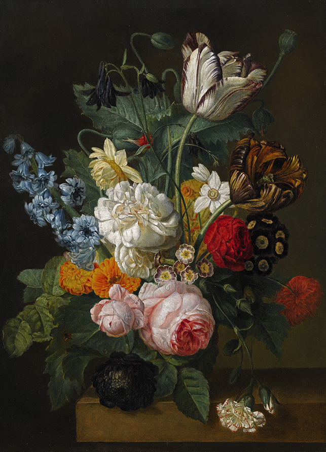Gerard van Spaendonck painted with both oil and watercolours. He contributed over fifty works to the Vélins du Roi, a famous collection of botanical watercolours possessed by French royalty. From 1799 to 1801 he published twenty-four plates of Fleurs Dessinees d'apres Nature (Flowers Drawn from Life), which were high-quality engravings for students of floral painting. Today, Spaendonck's Fleurs Dessinées d'après Nature is a highly treasured book on floral art.