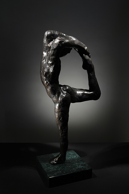 Far larger than the other figures in the series, "Dance Movement A" achieves a form which is both representational and abstract. Rodin has abandoned much of the anatomical precision which characterizes his earlier work. Instead he has treated the figure in a summary fashion so that he might capture its energy and emphasize the dynamic circular form achieved by the dancer as she reaches back with both hands to grasp her right foot. The clarity and energy of "Dance Movement A" finds a close affinity with the figures in Henri Matisse's dance pictures of 1910-1912.