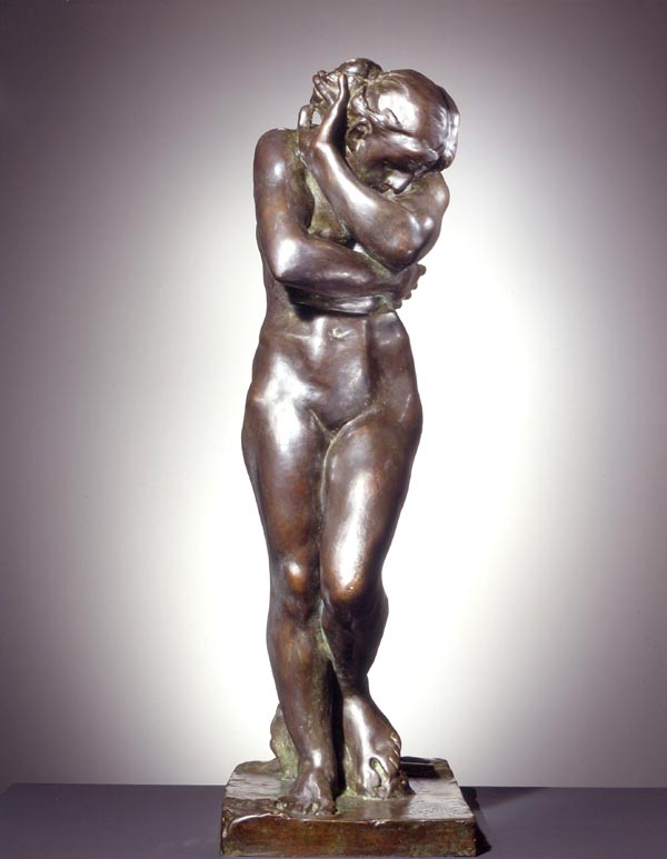 Like The Age of Bronze and St. John the Baptist, Eve is one of Rodin’s grandest standing figures. Resigned, sorrowful, and tentative, Eve contains her emotion. She shares such internalization with some of Rodin’s greatest figures, The Thinker and Jean d’Aire from The Burghers of Calais among them. Eve embodies a pessimistic view of human fate, a pessimism that was to deepen with Rodin’s reading of Dante. The first model for Eve was Adele Abruzzezzi, a young peasant woman from the mountains of central Italy. Rodin explained the lack of finish, visible in both the face and body, as a result of Adele’s leaving his studio because she had become pregnant. For the slightly later, smaller version of Eve, Rodin employed a thinner English model. This second version of the pose is more refined: the form is made more sensuous by Rodin’s softening details of the anatomy and by his reducing the accidents and animation that characterize the surface of the larger figure. |