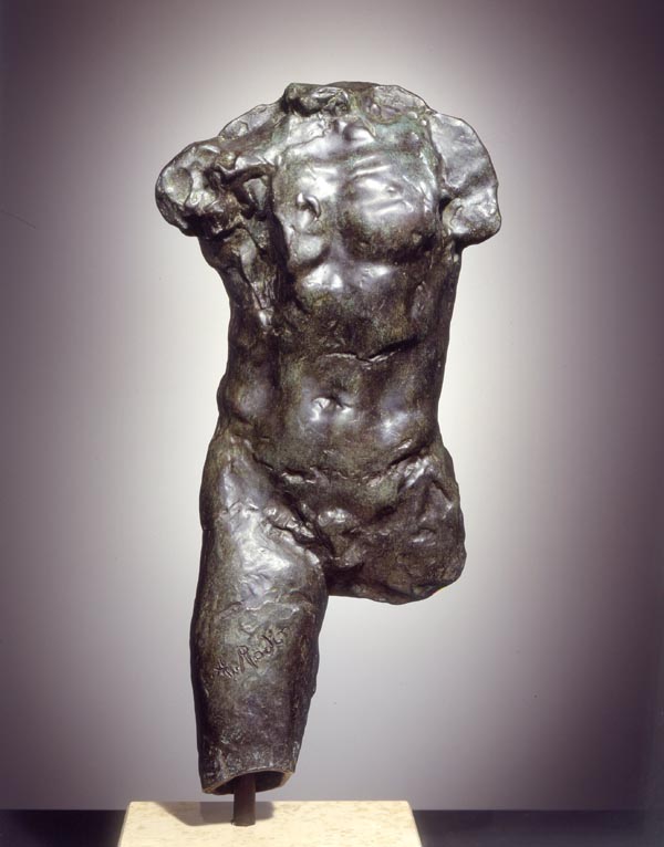 In fact, this figure is a direct adaptation of motifs found in Michelangelo’s drawings and waxes. Rodin had the torso on display by 1888 and cast it in 1894. Its desiccated surface and incomplete formal tension made it appear a ruin from antiquity or the Renaissance.