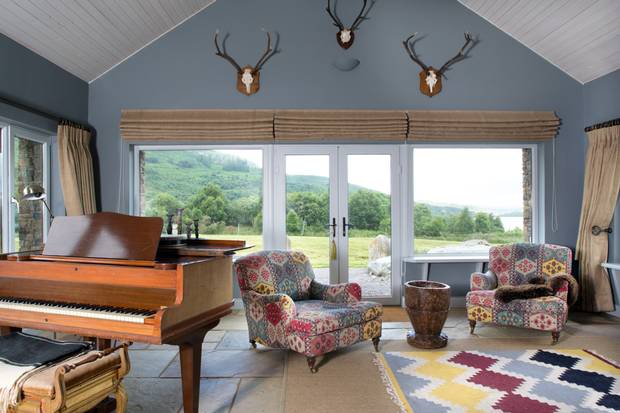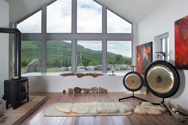 She goes on to explain her method: "I don't use brushes, I paint with my hands, and I meditate before I paint." Gemma's painting led her back more and more to Kerry, and, some years ago, on one of her trips back, she happened on the house of her dreams, literally. She had driven out to Caragh Lake with her friend Peig, and drove up the mountain. "We turned a bend and saw this house, and I said to Peig, 'That's my house'," Gemma recalls. "I went back to England, and later in the week, Peig called to see the owner, but he said, 'It's not on the market'. Eighteen months later, I was idling on the internet and saw it, 'My god, it's for sale'. That was four years ago last April." When Gemma bought the house - a stone building, with massive expanses of glass, to take full advantage of the views of the surrounding lakes and mountains - it was a shell, and she decided to keep it fairly simple. There was no second floor at the time, and she opted not to add rooms over the main living space - which incorporates the kitchen, the dining area, and the living room - instead, keeping that area double height, with exposed beams. Off it, is a music room at one end, and two bedrooms and a utility area at the other end. She added an upstairs bedroom and a stairs to access it, and then set about furnishing the whole house in a very particular way. "Skellig Rock had a big influence on the way I looked at it. Dwellings exist to protect us from the elements, and that's what I wanted - simple protection. So I kept everything natural. When I'm painting, I haven't a clue, one stroke leads to another, and it was the same with the house. I had a lovely builder and it all evolved; it was so easy, so stress-free," she notes. The builder put in natural oak beams, panelling and units, and Indian sandstone on the floor. Gemma then put lots of sheepskins everywhere. Even the curtains are natural. "At the beginning, I had thought, 'no curtains', but I realised I'd need them for warmth.