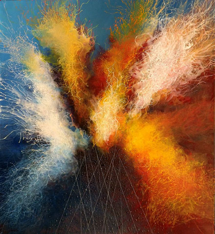 MAURIZIO CAMATTA Italian artist Maurizio Camatta is an extraordinary presence in the contemporary art world. As an Abstract Expressionist his use of colour appears haphazard, provoking an emotional response in the viewer. These are dust explosions, rockets blazing through the layers of atmosphere, rainy skies and steamed up windows. There are fireworks imploding in the damp fog; stars bursting and dissolving into Northern Lights. The paintings have an oddly meditative quality to them, allowing your mind to drift off over Turner-esque skies to better places, completely absorbed… After this initial magnetism and beauty, you’ll find that there is something ‘other’ lurking beneath the aesthetic. These crepuscular scenes are the ideal habitats for darker creatures, for bats and insects hovering in clouds, a quiet thrum vibrating just below the surface. In murky twilight, your eyes finally adjust, revealing that not everything is as it first seemed, that there are patterns and faces and shape-shifting forms. Nothing is there by accident- there is a proper order to the chaos. Camatta’s artistic process is more precise than it appears, with every shade and overlap engineered to achieve perfect equilibrium. Concerned with his studies of colour theory, logic and balance, this expressive artist is also pure scientist.The purchase document contains the images of the available artworks with their prices. It is password protected. To obtain the password please contact us. |