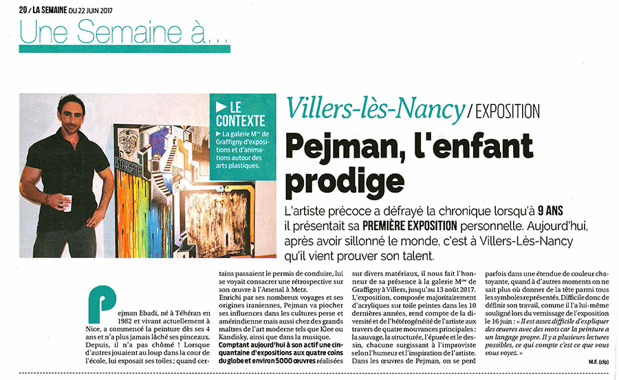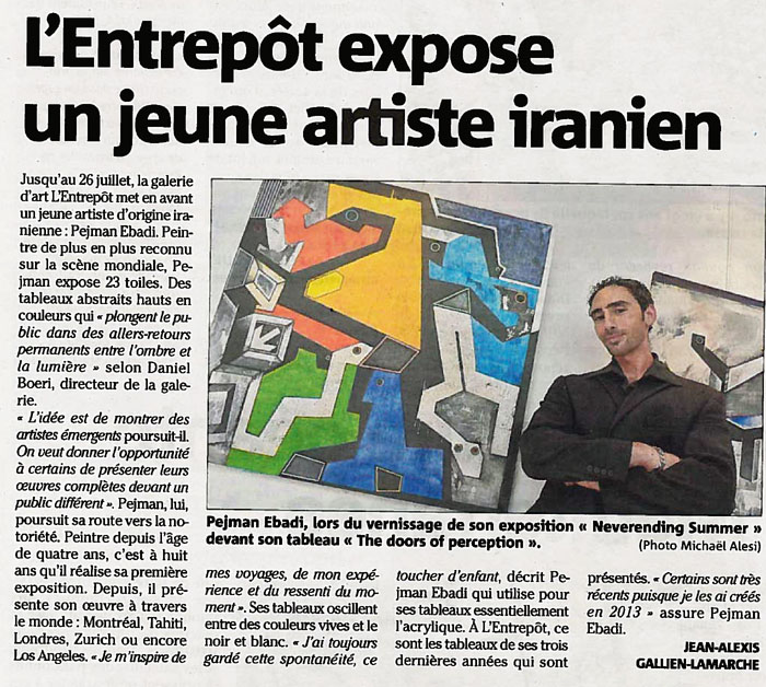 Pejman Ebadi had his first group exhibition in 1988 in Paris when he was six years old and his first solo gallery exhibition at the age of eight. His works are exhibited all over the world - Montreal, New York, Tahiti, Cannes, Hamburg, Lyon, Bern, Wuppertal and so on and so on.