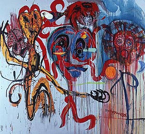 Astonishing is the great variety and richness of forms, signs, characters and patterns. Pejman's use of color is anything else but arbitrary. The young guy definitely has a great talent. He must be more than the product of a smart art marketing manager. It is the absence of a specific style that shows his real talent. Young stars - no matter whether singers, musicians, actors or painters - often come up with a successful but limited gimmick. They become famous over night, then try to repeat the success again and again and disappear soon, because they are incapable of creating anything else than different variations of one pattern.