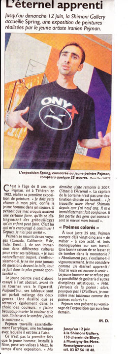 The hype about the prodigy boy is obvious, but his talent is too. The art works of Pejman reflect the experiences of an adolescent of our times. His images are often violent, aggressive, obtrusive. Others show subtle use of colors and compositions.