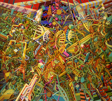 Each of his vast canvases is composed of complex structuring and juxtapositional interweaving of clearly defined objects both animate and inanimate. They represent or re-structure the elements of experience not as a continuous reality but as they appear in inner vision.