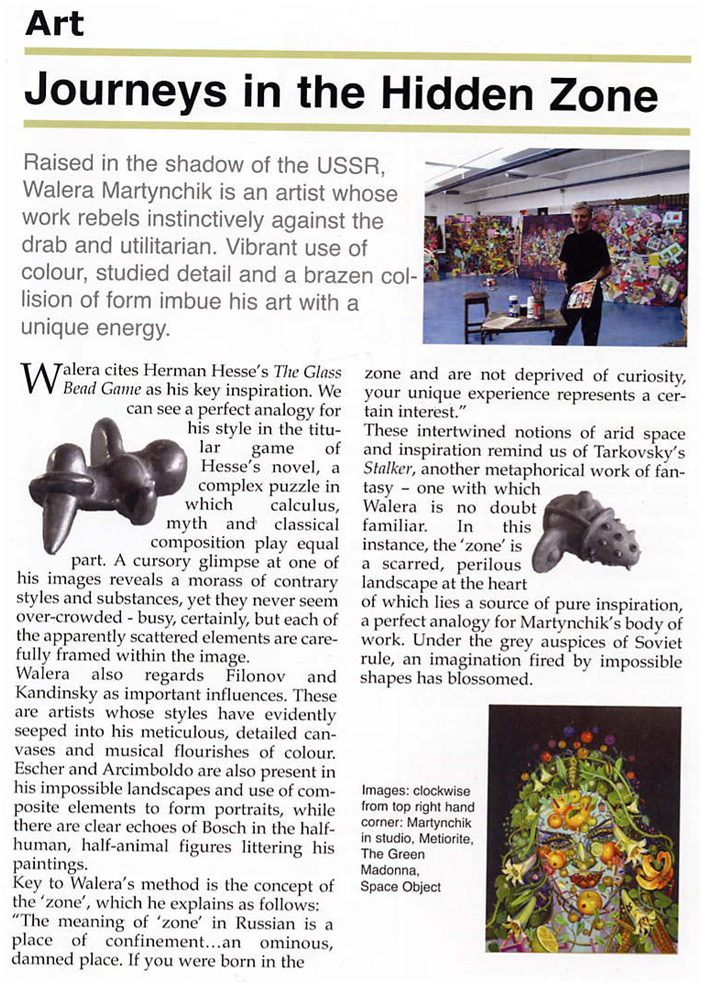 ART IN LONDON, Art Magazine. Autumn 2009 “Famous Contemporary Russian Artists” exhibition. November 2009. Bedfordbury Gallery, Covent Garden, London Walera Martynchyk is the only London-based artist in the exhibition. He was born in Belarus in 1948 and 20 years belonged to the Nonconformist movement in Soviet Art. He was a founder of Forma - the first group of underground artists in Belarus. Martynchik’s creative development and commitment to painting was inspired not by official ideologies but by the work and writings of two innovative and influential Russian artists - Filonov and Kandinsky and by creative thinking of the composer Stravinsky. “It must be difficult for a western viewer, used to liberalism, to decades of Pop Art and artistic eclecticism, to comprehend what it was like to grow up in a totalitarian regime, grey, dangerous and above all simplistic, with the stagnation produced by banal simplification” says Martynchik.“ I grew up in such a regime. My inspiration, my artistic way out of stultifying attitudes I and others like me encountered was the “The Glass bead Game” (1943) of Hermann Hesse, who too had been exploring a struggle of the spirit against the power of barbarism. His game involved using as many approaches as possible from the past - the cornucopia of cultures,. As my own protest against - and escape route from - the apathy bred by malign authority, I developed a style that uses the gamut of artistic styles from the past-glazing, geometry, perspective and portraiture - together with dizzying echoes of chaos end entropy. It dips into cultures riches of the visual arts , especially painting.” LE COTIDIEN DE PARIS 1992 "Le Mond Suspeople de Martynchik" Originally from Belarus, Martynchik settled in London, after spending some time in Poland. His first exhibition in Paris is a revelation, as he has already found, at the same time his maturity (the height of his powers), his savoir-faire (know-how) and his own domain (Field, Province) which resembles no other. He paints endless canvases, whose every recess is covered with multiple colours, layered geometric shapes, with half–objects and small figures. The whole forms an inextricable tangle, as if our world were irremediably (incurably) destined for the dustbin or for a (traffic) jam from which it was no longer able to extricate (free) itself. The paintings can be viewed from all directions ,as there is no longer high or low, north or south, nor beginning, nor boundary. Within this heap, if one looks closely, one can discover geometric elements, boxes, tiny armed warriors, a pitiful Icarus, squares, tubes, taps, an unfinished stucco Madonna, masks, pyramids, rockets, architect’s models, scaffolding: all the means necessary to furnish a carpenter’s workshop. But there are also lizards piping, clock mechanisms. Generally, when brick–a–brack (odds end ends) is (are) piled up like this, in the work of gesture painters, one has impression of a gigantic disorder, of suffering on a grand scale. This is not at all the case with Martynchik, who remains master of his overabundance and who paints each detail with absolute precision. Although the anthropomorphic part of his art is minimal – are we not details of a universe which structures itself without us? – one infers from this that man is only one ant in an enormous flood. This realisation brings no fear; there is joy and rhythm in the quivering of this painter, who knows – and is this not rare these days? – the meaning of work, and the requirements of a true oeuvre (opus, work), worthy of the name.