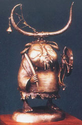 Though exotic to the Western eye (and perhaps a bit kitschy), the sculptures strike a chord as well. Dashi's characters would be comfortable in the "Lord of the Rings" or "Star Wars" sagas. An aura of myth and the supernatural pervades  his work,  even  the  animals. His  shamans, in their elaborate headdresses of tusks and horse skulls, exude a force that might give Darth Vader pause.