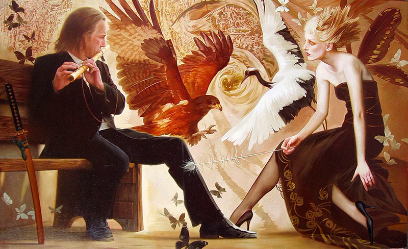 This 44-year-old native of Moscow portrays women who live in a mystical world, surrounded by bizarre forms, signs and objects: a world real to them, however steeped in fantasy. She began painting as a toddler. Her father, an artist, became her first and most important teacher, encouraging her to paint alongside him in his studio. Thirteen years of state structured curriculum established Valueva's art and drawing skills in "social realism." In 1975, at age 9, she received the Gran Prix at the annual International Exhibition in Delhi, India, a juried exhibition of paintings by 150,000 children from 35 countries. She placed third in the same competition in 1977, won the gold (Gran Prix) again at age 13. In 1977, a documentary featuring Valueva and other young achievers in art was shown in movie theatres across Russia. The same year she was highlighted on the front page Soviet Union, a popular monthly magazine. Few realize such fame in their lifetime, much less as a youngster. In the Seventies, the only style permitted for Soviet artists remained social realism. The first time Valueva opened art books and was exposed to images by Klimt, Alfons Mucha, Sargent, and Alma-Tadema, she was stunned. She realized that her passion lay with those artists, and not with the "acceptable" realism. Valueva continued to paint the obligatory art for school, but at home she allowed her true style to emerge. Her father had given her his studio, and she lived and worked there. Soon a steady stream of people interested in her emerging style--rather than "official" art --flocked to her studio. Before graduation she began to sell her "hidden" work to dealers in Belgium, France and Poland. Valueva had her first solo show in a Moscow gallery in 1993. Influenced by photographs left by her great grandmother, a ballerina at the Marinsky (Kirov) Ballet Theatre, and by her great grandfather, an officer in the czar's army, the twelve paintings she created for the exhibit generated immediate interest. A Japanese publisher purchased all of them, and requested more. In 1995 she was commissioned by The Bolshoi Theatre for a ballet collection. Invited to rehearsals by the art director of the company, Valueva created 15 painting that are on permanent display in the Bolshoi foyer. Nostalgia for the elevated, magnificent "silver age" of Russia has drawn her to the past, a period known in the West as Art Nouveau, Jugendstil, or Liberty. This is where the characters of Valueva's paintings are destined to dwell. "It's hard today to trace back the origins of my affinity for Art Nouveau,” says the artist. “I feel I was destined to love this art from birth. This elaborate, refined, truly aristocratic style, regardless of subject matter, captures the fragility of all earthbound existence.”