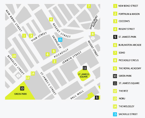 15 Sackville Street is a new development in Mayfair that provides approximately 34,000 sq ft of high quality modern office accommodation and three luxury apartments. Situated on an exclusive Mayfair street, 15 Sackville Street’s impressive exterior matches the impact of its interior. Bespoke glass and metal artwork by Rebecca Salter create an elegant façade and distinctive main entrance unique to the street. The reception area uses natural materials of exceptional quality, consistent with the commitment to deliver elegance and durability. Stone and walnut accented with bronze create a welcoming environment, while two 13-person elevators provide swift access to seven floors of office accommodation. 15 Sackville Street is designed on a modular basis to offer maximum flexibility. Every floor is column-free and designed to accommodate the spatial needs of any business. Quality of materials is paramount; separate male and female facilities at each level are partitioned by glass and walnut, and finished with superior ceramic tiling and Italian basalt vanity tops. 15 Sackville Street is a location that suits all tastes; a neighbourhood rich in culture, cuisine and community. Michelin Star fine dining, exclusive hotspots and fashionable hangouts are all just moments away, while world famous museums and galleries offer a profusion of world-class art for anyone in search of culture. For those whose preferred lunchtime is more in tune with peace and quiet, then a soft leather armchair and newspaper can be found at one of the districts exclusive clubs, or experienced by strolling through one of the areas many beautiful parks and gardens. 15 Sackville Street is a traditional Mayfair location. The property benefits from the amenities of St James’s; The Royal Academy and The Ritz are nearby as are world renowned brands such as Ralph Lauren, Cartier, Asprey’s and Fortnum & Mason. 15 FACTS ABOUT SACKVILLE STREET