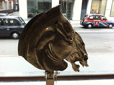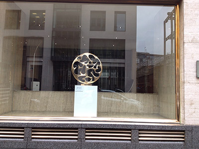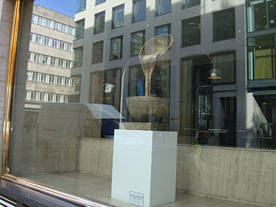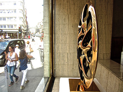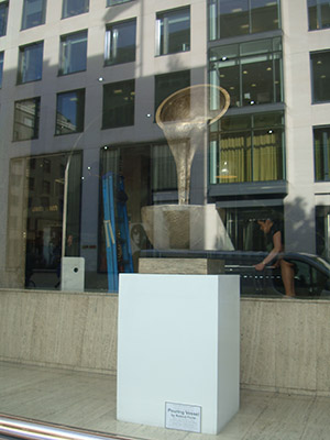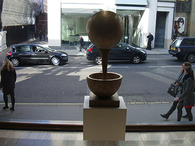 Metaphysics and Moore The Time & Life building is a grade II listed building located on the corner of New Bond Street and Bruton Street in Mayfair. Mounted on the transom above the entrance is a nickel bronze sculpture, 'The Symbol of Community' by Maurice Lambert. The architect Michael Rosenauer often integrated art into his designs, and there are also four Henry Moore sculptures visible around the terrace. Hay Hill Gallery has previously displayed large-scale sculptures in the main window, including Hand Of God by Auguste Rodin, The Horse Head by Unus Safardiar, several sculptures in the co-operation with arTbridge, and recently (July - December 2014) by invitation of ARTful - Gianfranco Meggiato’s golden Tension Disc With Sphere, and then the Pouring Vessel bronze by Roland Piché. The latter takes inspiration from the artist’s fascination with physics and the meaning of reality, leaving a more specific interpretation up to the passer-by. This piece is an optical illusion; perfectly balanced and appearing to defy gravity. About the artists: