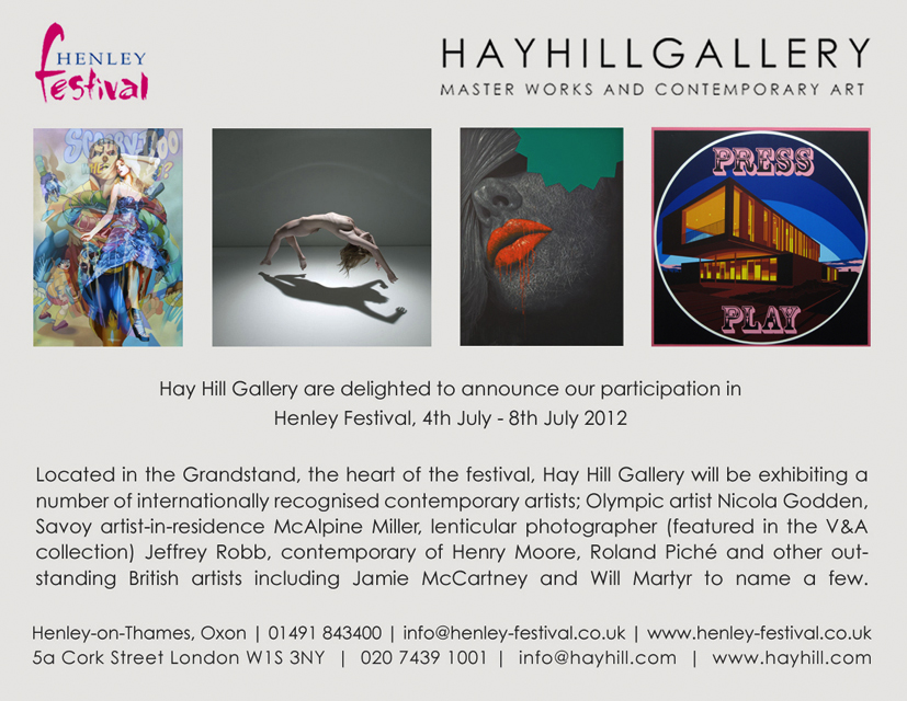 Originally established in 2002 the Hay Hill Gallery represents a number of internationally recognised contemporary and modern artists; Olympic artist Nicola Godden, Savoy artist-in-residence Stuart McAlpine Miller, lenticular photographer (featured in the V&A collection) Jeff Robb, a contemporary of Henry Moore, Roland Piché, and other international artists including Jamie McCartney, Will Martyr, Zorikto Dorzhiev, Massimiliano Cacchierelli Principi, Björn and Amanda Sjöling and Andy Cheese.