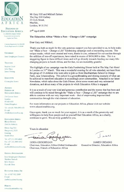 The 'MAKE A FACE - transform a life' campaign sees internationally renowned personalities lending their support to Education Africa by painting blank masks for auction at this years gala dinner to be held at the May Fair Hotel in London on March 31st 2009, with the auction being held by Sotheby’s Olympia Chairman Lord Dalmeny.