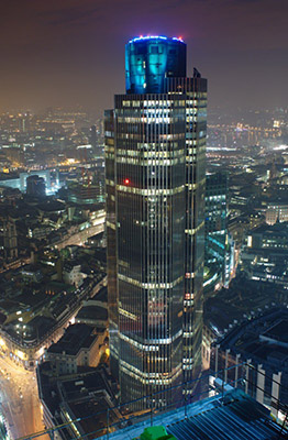 Tower 42, according to Wikipedia, is the third-tallest skyscraper in the City of London and the eighth tallest in Greater London. Its original name was the National Westminster Tower, having been built to house the National Westminster Bank's international division. Seen from above, the shape of the tower resembles that of the NatWest logo (three chevrons in a hexagonal arrangement).