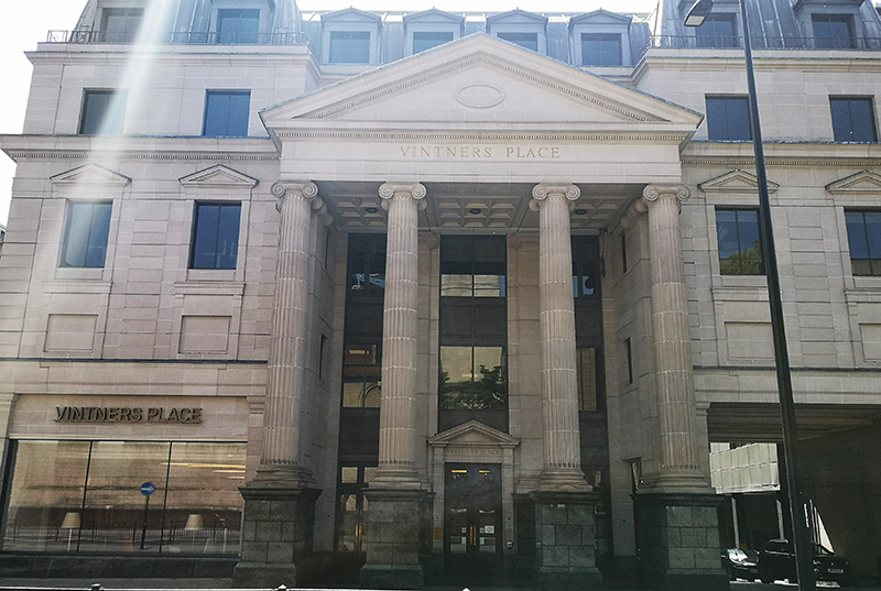 Vintners' Place is a 1980s classical-style office building in the City of London. It faces the Thames and has entrances in Upper Thames Street and Queen Street Place, with the building surrounding Five Kings House and Vintners' Hall. The neighbouring building on the west side is Thames Court, 1 Queenhithe, while on the east side Queen Street Place leads to Southwark Bridge.