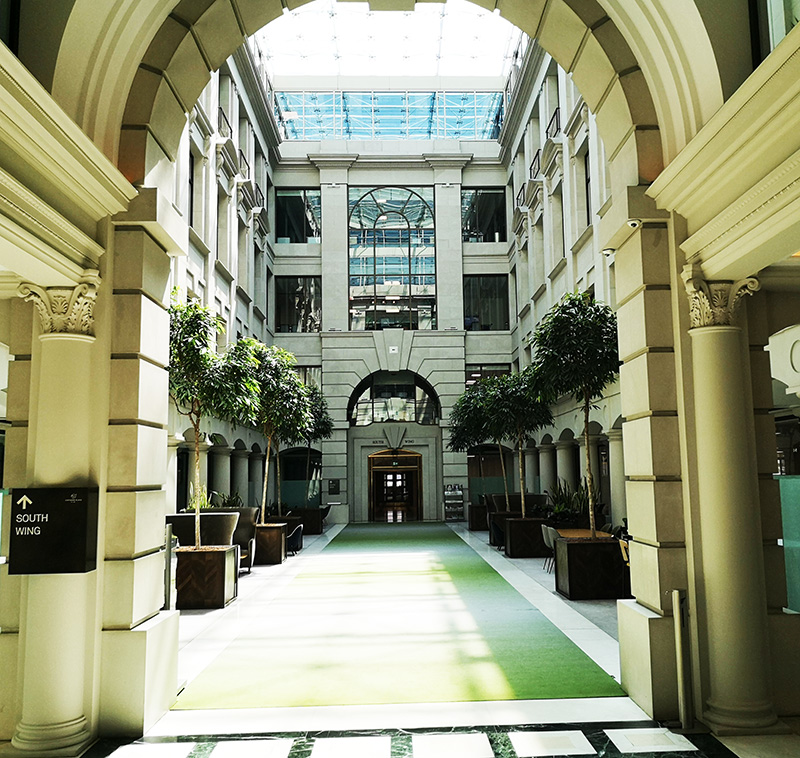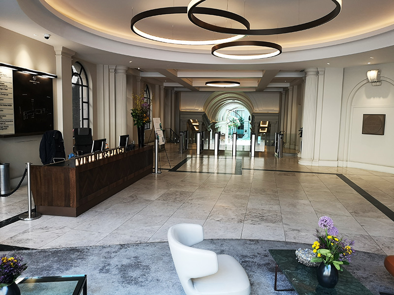 Vintners Place is a new, 37,000 m˛ office building overlooking the Thames in the City of London. Built in a classic style, it is next to the historical, listed Vintners Hall owned by the Vintners Company. The client had requested that the marble floor be realised from interesting and different types of material and should be inspired by St Peter’s in Rome. Whinney Mackay-Lewis, who were also the building’s architects, won the international competition for an 800 m˛ floor in a pattern that displayed a range of colours and explored the chromatic wealth and veins of different marbles from countries around the Mediterranean.