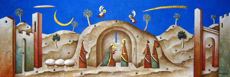 Drawing profoundly philosophical thought from his personal studies into mystical, biblical and Celtic mythology, D’Vatz’s emblematic works are meticulously detailed. He fuses vibrant byzantine colours with ancient culture and the traditions of Central Asia to create powerfully iconic images. Luminous winged stags with bronze flags guard black panelled doors; ghostly cities are embroidered upon clouds. Mist settles eerily about oddly tall hunters as dust billows up from galloping hooves. These elegant mythical creatures lure the viewer into a hauntingly mnemonic experience.