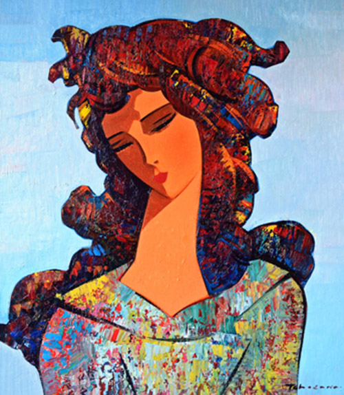 Igor Tcholaria’s Modigliani-esque technique is also concerned with the depiction of perception and reality. Revealing beauty in the everyday, the artist places porcelain-skinned women within heavily patterned backgrounds. Sooty eyes peer out from under flattened hats, their pale skirts and pantaloons billow out around them. The artist plays around with contrasts of volume, changing his mind between two and three dimensional effects, loud and soft colours. This push and pull creates a soothing optical illusion- we drift in and back out of imaginariums, stirred awake by more than a nod to those old masters who first inspired him.