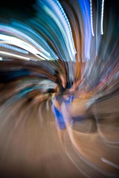 In Tunisia, he was pursued for months by secret police, often to the perturbation of his travelling companions – a photographer being highly suspicious in a police state run by 'the Caucescu of the Mediterranean'. While photographing the port of Tabarka in a storm (an illegal activity there) he was pursued by the harbour authorities, leading to him to depart rapidly mid way through a long exposure on a tripod – the resulting image resembling a Jackson Pollock painting, rich saturated tones and sinewy trails and splashes of colour. An abstract style was born via a fortunate accident.