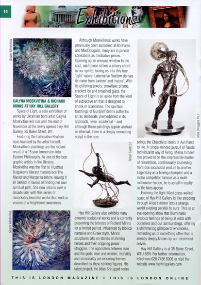 Hay Hill Gallery also exhibits many dynamic sculptural works and is currently presenting the bronzes of Richard Minns for a limited period. Influenced by biblical narrative and Greek myth, Minns' sculptures take on stories of shining heroes and their crippling power struggles. The opposition between man and the gods, men and women, mortality and immortality are recurring themes described by these striking figures. His latest project, the Atlas Shrugged series brings the Objectivist ideals of Ayn Rand to life. In single-minded pursuit of Rand's Individualist way of living, Minns himself has proved to be the irrepressible master of reinvention, continuously journeying from one successful venture to another. Legendary as a boxing champion and a rodeo competitor, famous as a multimillionaire tycoon, he is as tall in reality as the tales appear.