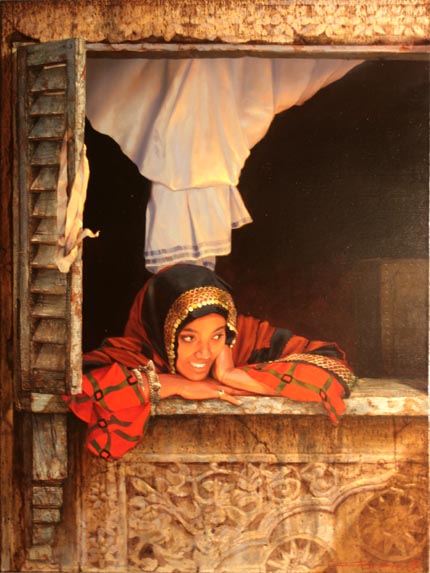 Plutenko, one of Russian leading contemporary artists is avidly collected and returns to the Hay Hill Gallery, where he held his second show in the UK in 2002. His mixed media and air brushing techniques with his graphic art origins have brought comparisons to the work of Jack Vettriano. This current collection of work is strongly influenced by the 19th century oriental school, championed by Alma-Tadema and Giulio Rosati. Scenes of the souk and the flavour of North Africa and the Middle East can be seen in ‘Cairo Railway Station', ‘The City I've Never Been to - Arrival', and ‘The Forgotten Kasbah'.