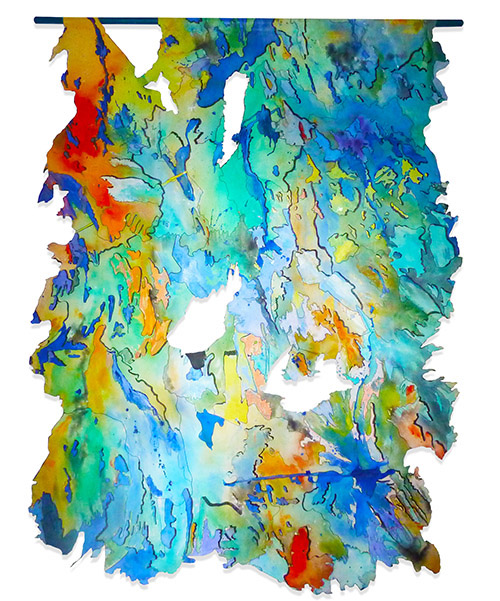 Her sculptural-paintings hang freely from poles; offered as bright sheets of music to be unraveled or decoded with the eye. By translating her sonic experiences into visually open rhythms, Tanner creates a sense of resonant tranquility. Using symmetry, colour theory, pattern and a special technique, Tanner allows the edges of the canvas to follow their own painted shape - not the traditionally rigid frame. Inevitably, this literal reworking of boundaries places full emphasis on colour psychology: Brilliant - in every sense of the word.